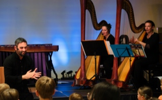 In ihren beiden Kinder- und Familienkonzertprogrammen zeigen die Musiker ihrem Publikum die beeindruckenden Instrumente Konzertharfe, Marimbaphon und Perkussion. Da Mitmachen erlaubt und erwünscht ist, können die Kinder besonders tief in die sorgfältig ausgewählten Kompositionen und ihren Klang eintauchen. Sie erleben das Konzert mit allen Sinnen, durch Bewegung, Tanz, Singen und Bodyperkussion. Zudem sammeln sie ganz nebenbei intensive Hörerfahrungen, instrumentenkundliches Wissen und lernen verschiedene Spieltechniken der Instrumente kennen. Aber nicht nur die kleinen Zuhörer werden zum Staunen gebracht. Mit Witz und Wissen haben alle Spaß an den Konzerten.